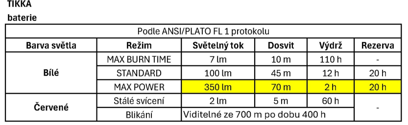 - Tři intenzity svícení: max. doba svícení, standardní (vyvážený poměr výdrže a výkonu) a max. výkon.