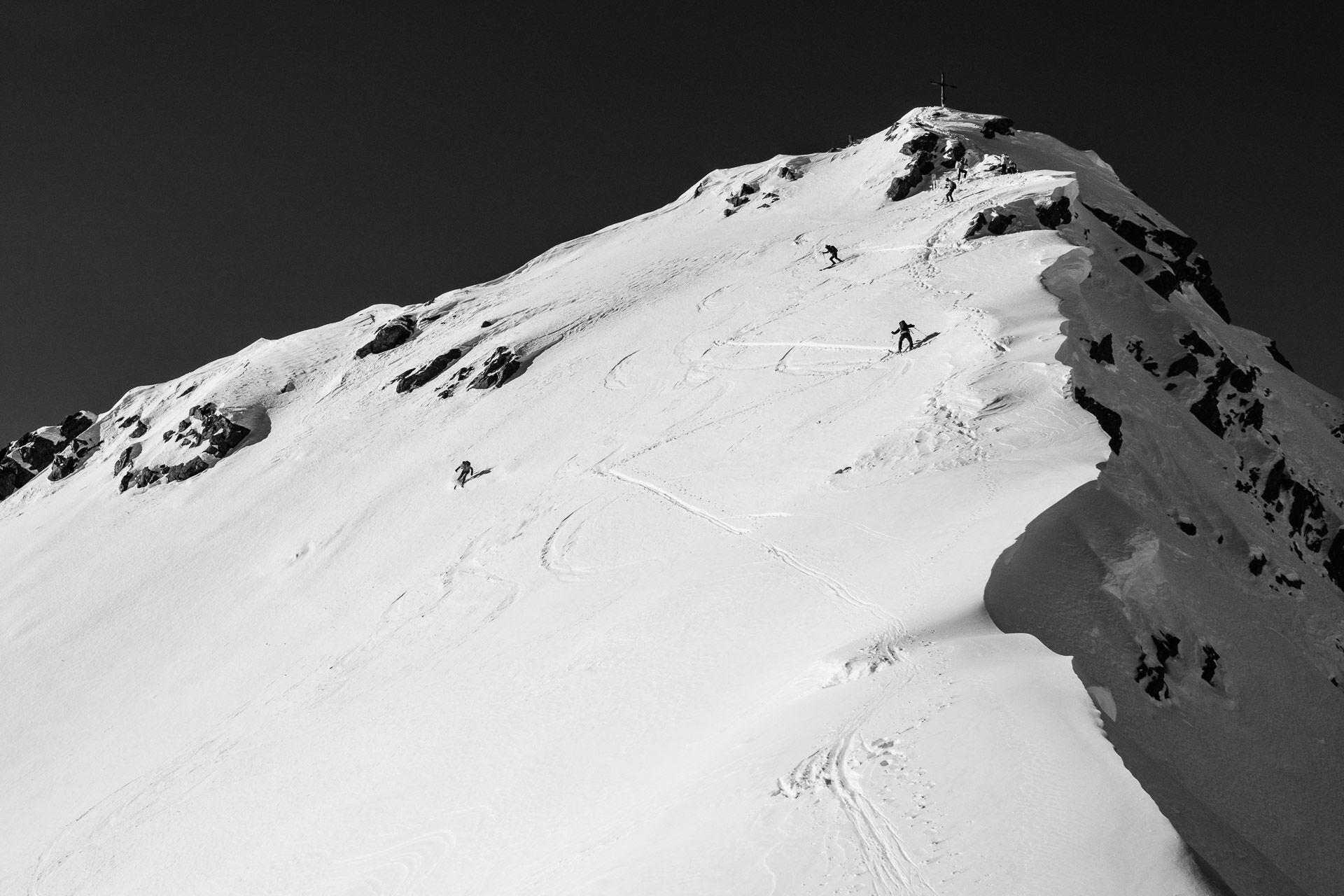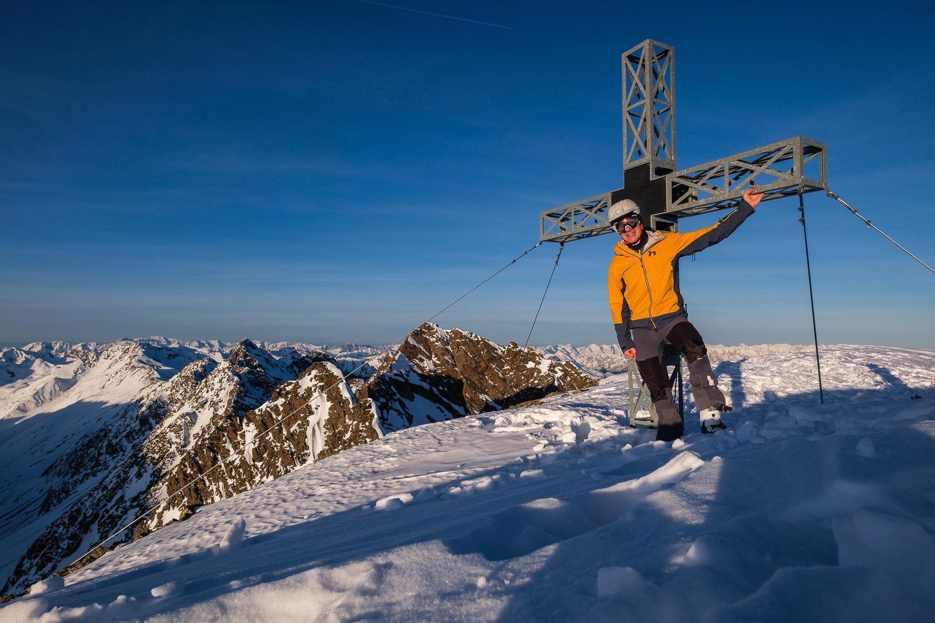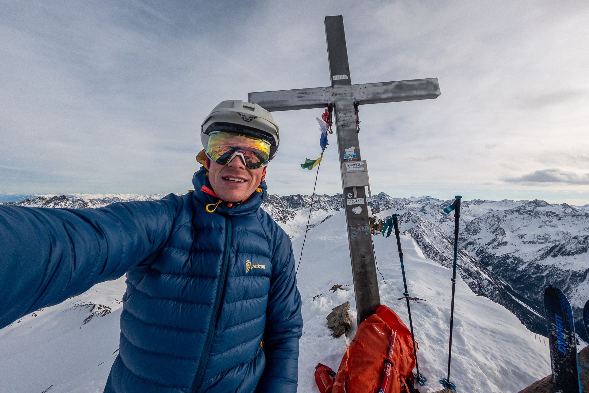 I přes pokročilou dobu tu nejsem sám. Závěrečným strmým hangem akorát sjíždí poslední dvojice. Posledních pár desítek metrů už se jde na botách, lyže nechávám asi 20 metrů pod vrškem. V krásném pozdním slunci si vychutnávám nejdřív výhled od kříže a po velmi defenzivním sjezdu strmé pasáže i prosluněné svahy nad sedlem. Za 20 minut jsem z vrcholu na Winnebachseehütte a zdárně se potkáváme s Lukym, kterému není dvakrát dobře.