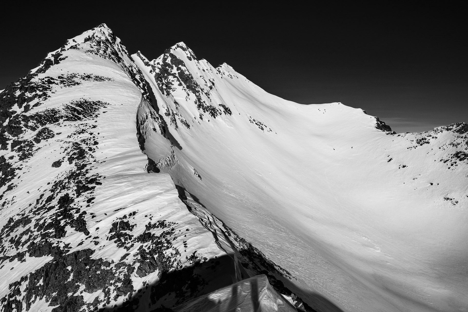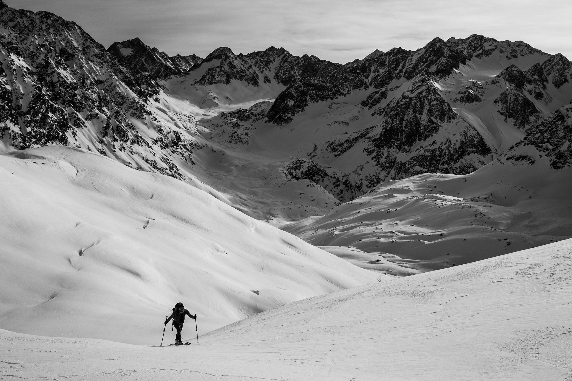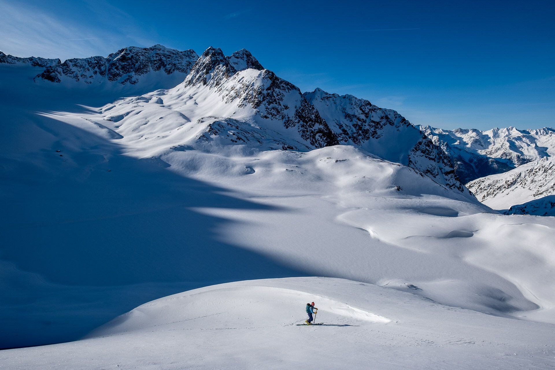 Na ledovci už je vidět hned několik mravenců, kteří přišli dlouhou trasou z Lüsens. Traverzem horní části ledovce se napojuju na výstupovku a lyže parkuju jen pár metrů pod vrškem. Je kolem poledne a den dneska vychází počasím na jedničku. Nasazuju lyže a těším se na sjezd. Slunečná orientace vypadá navzdory jinak divokým podmínkám slibně. To se opravdu naplní. Strmý začátek je výživný, oprašuju chabé znalosti skákaného oblouku. Když už se to pokládá, vypne mi špička a zároveň i sichrák a jedna lyže se vydává napřed. Naštěstí se opět zdárně potkáme, všechno zamknu a po krásném ledovci přijíždím do Längentalu. Mrazivými svahy jedu dlouhým traverzem k chatě Westfallenhaus.