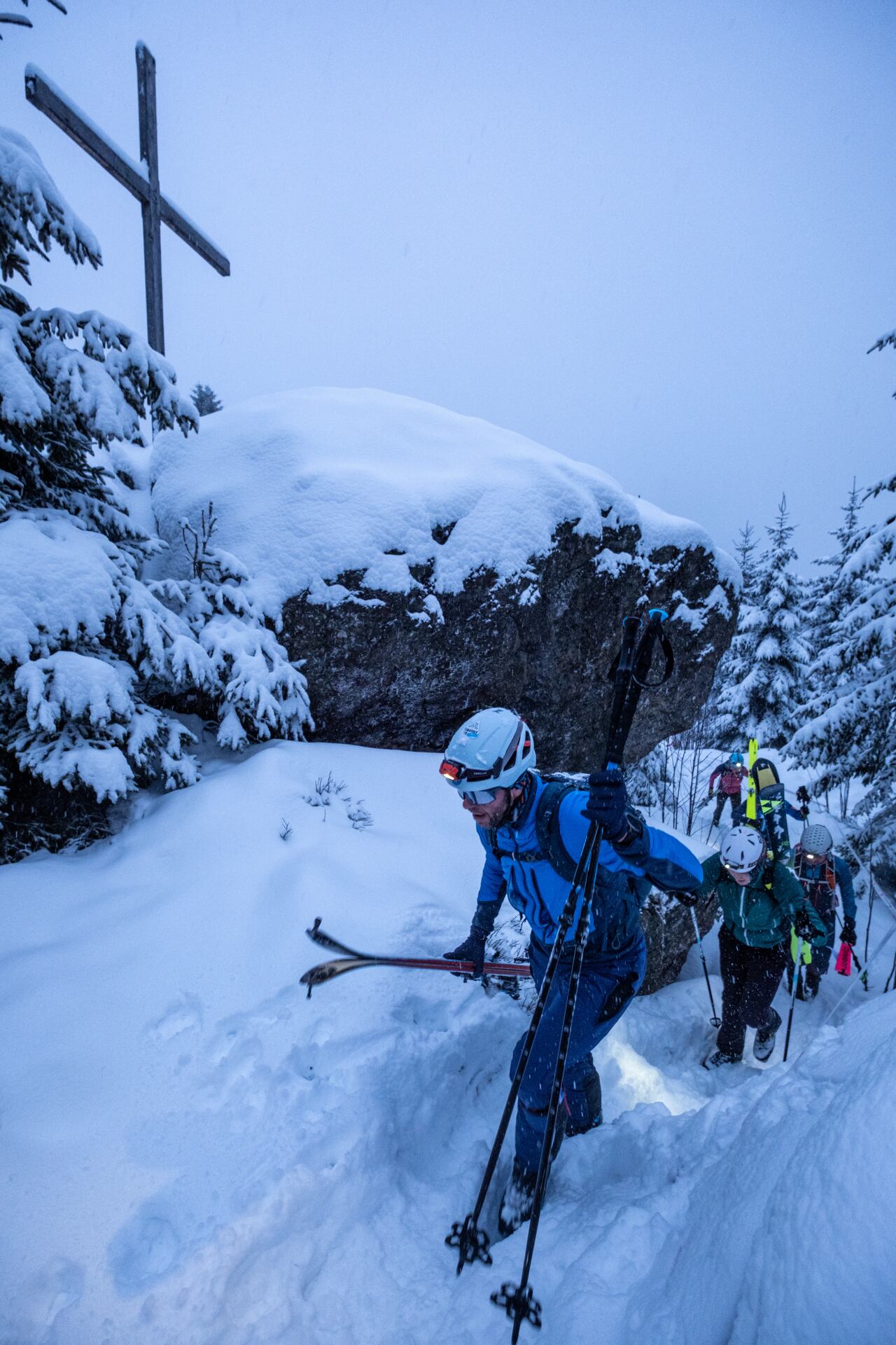 Na vrcholu si závodníci lyže sundali a před sjezdem dolů je čekal je průsmys skalkou na botách