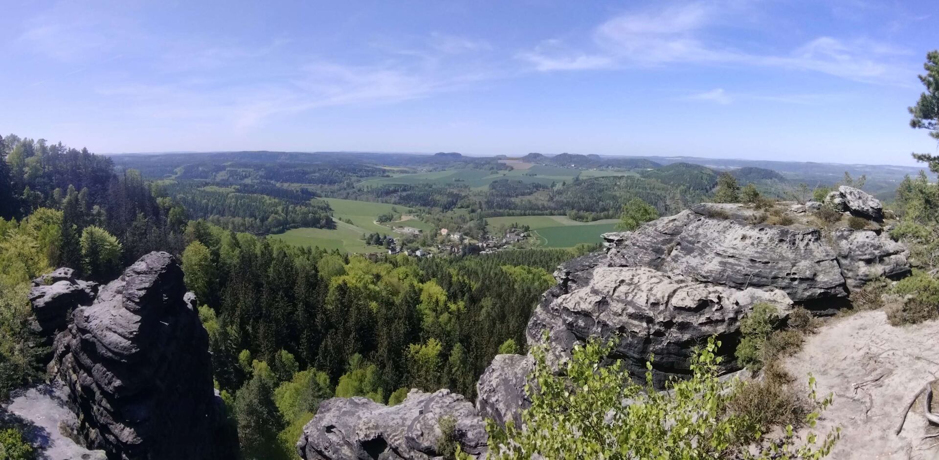 Ráno vyrážím do slunečného dne. Nad kempem procházím skalní oblast Nebeská říše se symbolickým hřbitovem horolezců. Jen malý kousek je to do vyhlášeného skalního města Tiské stěny, ale tam jsem byla loni a teď v sobotu tam bude spousta lidí, tak pokračuji po stezce zpátky do Německa. Nad Rájeckým údolím vede stezka po hraničních kamenech a nabízí vyhlídky na údolí a na vrcholy skalních věží, některé už obsazené horolezci. Po opuštění hranic se stezka klikatí lesem okolo vyhlídky Zeisigstein. Potom je skal méně, zato se prodírám plantážemi borůvčí. Dnes spím v chatě Kamphütte.
