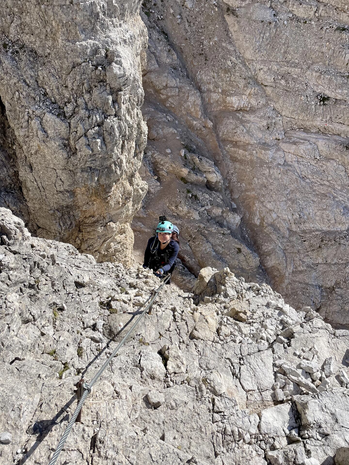 V horku v Dolomitech už to moc praktické nebylo. Zouvat jsem se nechtěla, takže jediná možnost byla mít nohavice stažené u kotníků, což je při lezení nepraktické, a hlavně jsou nízko nad zemí, takže se můžou lehce ušpinit.